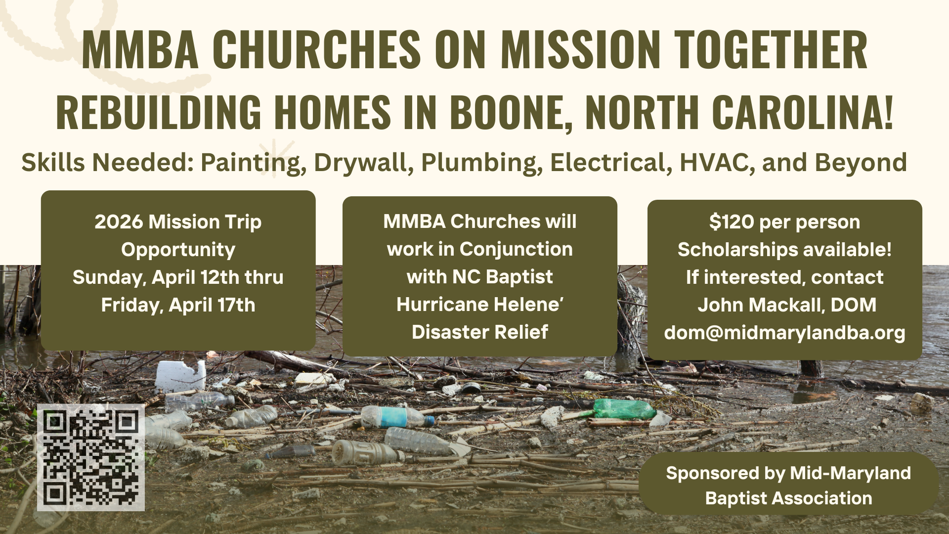 We will be helping with the continuing rebuilding efforts in Boone, NC, following the devastation of Hurricane Helene. April 12-17. $120/person, scholarships are available. There will be a variety of construction projects happening from painting to electrical. Click here to register or see Pastor John for more information.